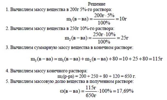 В один сосуд вылили 200 г 5%-ного раствора некоторого вещества, 250г 10%-ного раствора того же вещества, затем добавили 80 г этого вещества и 120г воды. Вычислите массовую долю данного вещества в образовавшемся растворе.