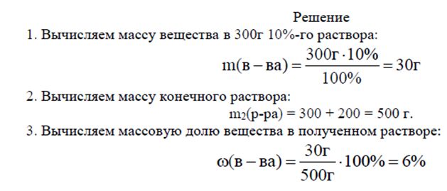 К 300 г раствора, массовая доля вещества в котором 10%, добавили 200 г воды. Вычислите массовую долю растворенного вещества в полученном растворе