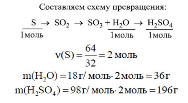 Сколько граммов воды потребуется для превращения всего оксида серы (VI), полученного из 64 г серы, в серную кислоту? Сколько при этом получится серной кислоты?