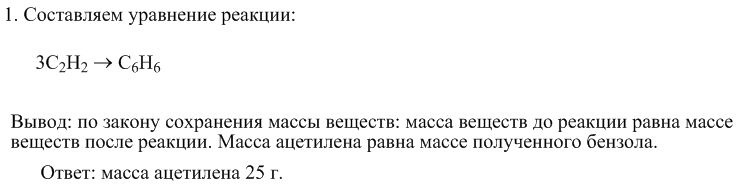 Рассчитайте массу ацетилена, которую нужно взять для получения бензола массой 25 г.