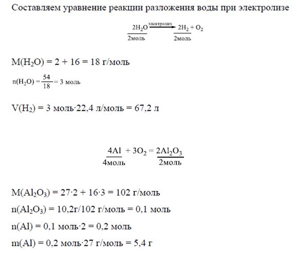 Какой объем водорода выделяется при разложении 54 грамм воды?Мне бы только составить саму формулу.P:Сколько граммов алюминия сгорело если образовалось 10,2 грамма оксида алюминия?4Al+3O2=2Al2O3 (после алюминия и кислорода идут маленькие цифры)