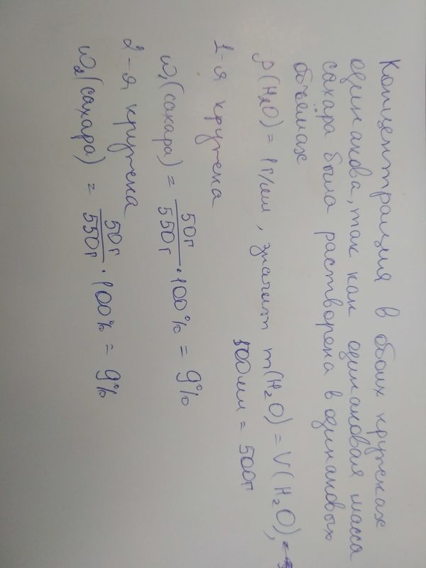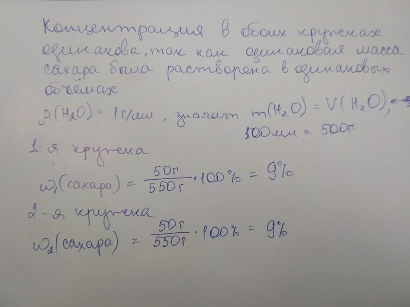 В обе кружки кинули по 50 грамм сахара.Кружка вмещает 500 мл. воды.После во вторую кружку долили 250 мл. воды.Вопрос: