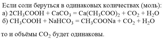 В какой из реакции выделиться больший объем газа, если соли беруться в одинаковых количествах (моль): а) CH3COOH + CaCO3 = б) CH3COOH + NaHCO3 =
