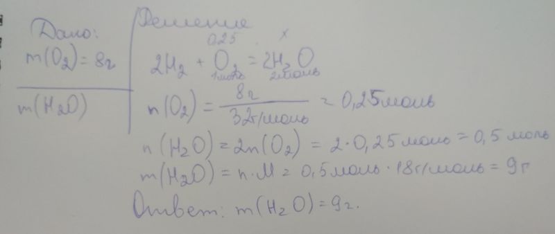 Рассчитайте массу воды, которая может образоваться из 8 грамм кислорода.(H2+O2=H2O)