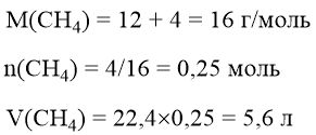 Для газообразного CH4 найдите: 1) объем (л) 4 г газа при н. у