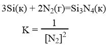 Напишите выражение константы гетерогенного химического равновесия для равновесной химической реакции 3Si(к)+2N2(г)=Si3N4(к)