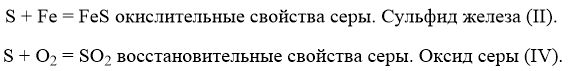 Напишите 2 уравнения окислительно-востоновительных реакций,одно из которых характеризует окислительные свойства элементарной серы,а другое её востановительные свойства.Дайте название продуктам этих реакций.
