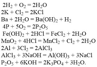 Вместо пропусков поставьте необходимые коэффициенты: H2+O2=H2O K+Cl2=KCl Ba+H2O=Ba (OH)2+H2 P+O2=P2O5 Fe (OH)2+HCl=MnCl2+Cl2+H2O Al+Cl2=AlCl3 AlCl3+NaOH=Al (OH)3+NaCl P2O5+KOH=K3PO4+H2O.