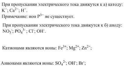 1.Выпишите отдельно из приведенных формул ионов - К(зар.+);NO3(зар.-);PO4(зар.3-);Сl(зар.-);Ca(зар.2+);Р(зар.3+); Н(зар.+); ОН(зар.-)-те,которые при пропускании электрического тока движутс к:а) катоду б) аноду 2.Катионами являются ионы:а)SO4(зар.2-)б)Fe(зар.3+)в)Mg(зар.2+)г)ОН(зар.-) 3. Анионами являются ионы:а)ОН(зар.-)б)Zn(зар.2+)в)Br(зар.-)г)Fe(зар.3+)