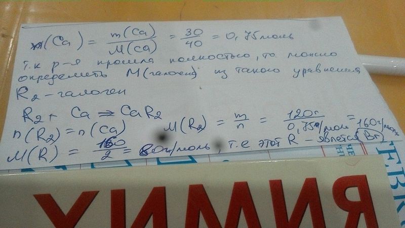 Кальций массой 30 г полностью прореагировал(-а) с неизвестным галогеном, масса которого 120 г. Определи, какой галоген вступил в реакцию. Запиши его русское название.