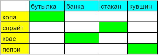 В бутылке, стакане, кувшине и банке находятся «Пепси», «Кока-кола», квас и «Спрайт». Известно, что «Спрайт» и «Пепси» не в бутылке, сосуд с «Кока- колой» находится между кувшином и сосудом с квасом, в банке – не «Кока- кола» и не «Спрайт». Стакан находится около банки и сосуда с «Пепси». Как распределены эти жидкости по сосудам?