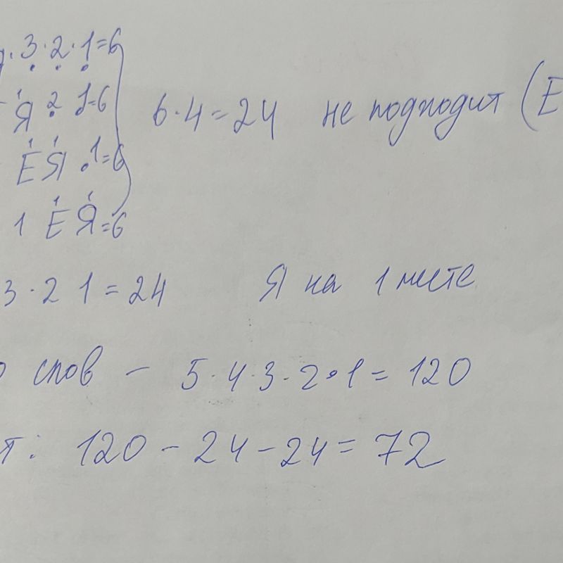 Задача по информатике Моргенштерн составляет 5-буквенные слова для своей новой песни переставляя буквы П,Е,С,Н,Я. Каждую букву можно использовать только один раз. Сколько слов может составить Моргенштерн, если известно что Я не может стоять на первом месте и после гласной?