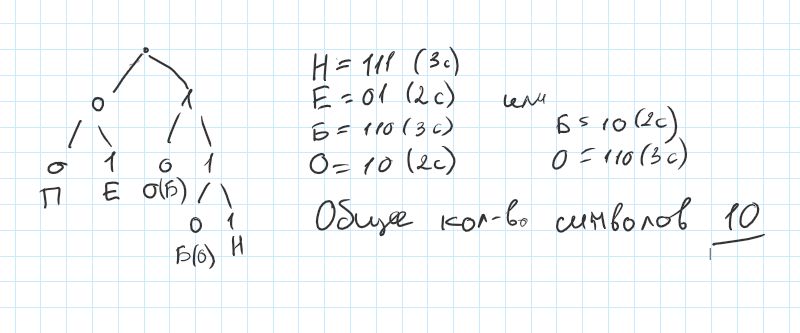 Все заглавные буквы русского алфавита закодированы неравномерным двоичным кодом, в котором никакое кодовое слово не является началом другого кодового слова. Это условие Фано обеспечивает возможность однозначной расшифровки закодированных сообщений. Кодовые слова для некоторых букв известны: П - 00, Е - 01, Н - 111. Какое наименьшее количество двоичных знаков может содержать код слова НЕБО?