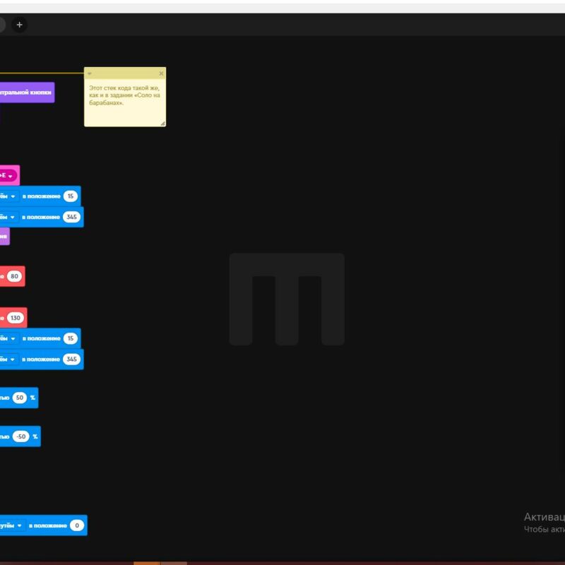 Модификация концерта Charlie в приложение Lego Mindstorms В приложении ознакомьтесь с активностью Drum Master!. Посмотрите, как реализованы выстрелы, которые производит Charlie в конце. Добавьте выполнение таких же выстрелов роботом в свой код, но левая и правая пушки должны стрелять во время выполнения блока для красного и блока для зеленого цветов