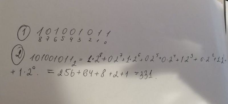 Перевод из двоичной в десятичную: 1)расставим с конца двоичного числа номера позиций начиная с 0(см. рисунок 1). Перевод из любой системы в десятичную происходит так: берем основание системы счисления (в данном случае 2) и идем по позициям: умножаем число, находящееся на данной позиции(в случае двоичной системы - либо 0, либо 1) на степень, где основанием этой степени является основание текущей с/с (в нашем случае 2), а показателем - номер позиции. Потом все полученные числа складывам, и получаем число в десятичной системе счисления. (см. рис 1).