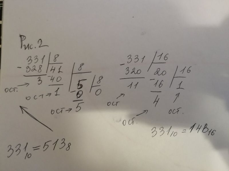Перевод из десятичной с/с в любую другую выполняется следующим образом: берем десятичное число и делим его на основание системы счисления в КОТОРУЮ переводим. Запоминаем остаток. Затем РЕЗУЛЬТАТ ДЕЛЕНИЯ точно так же делим на основание новой с/с. Запоминаем остаток. Таким образом производим деление, пока в результате не останется 0.(см. рисунок 2). Теперь записываем все полученные остати в ОБРАТНОМ ПОРЯДКЕ. (При этом если переводили, например, в 16-ю систему, то остаток 10 = А, 11 = В и т.д.). И так получаем число в новой системе счисления. Перевод данного числа в 8-ю и 16-ю систему см. на рис. 2.