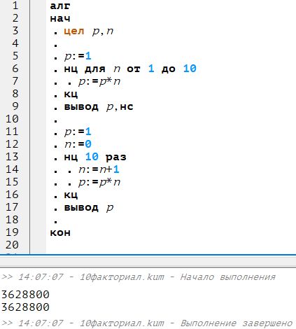 КуМирВычислить произведение первых 10 натуральных чисел.С помощью цикла-до или цикла-N раз