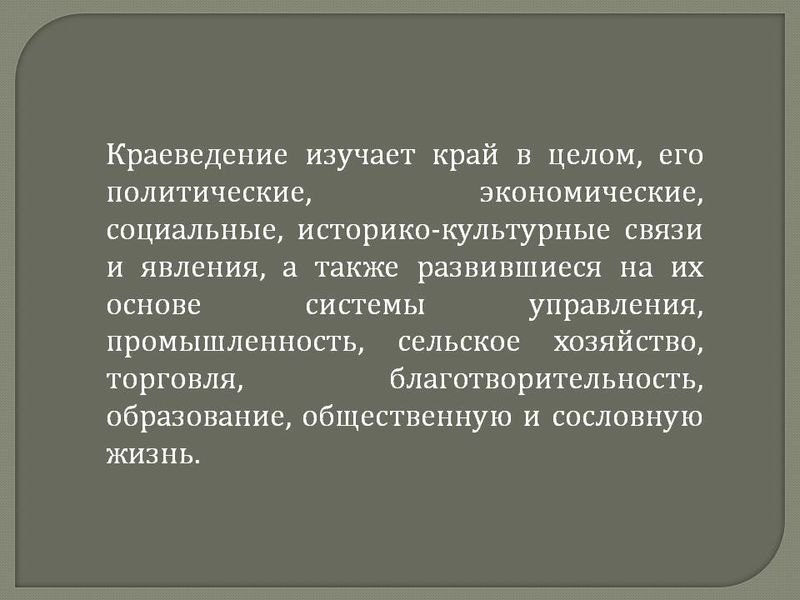 Краеведение занимается изучением комплекса сведений о природе, истории, языке, экономики, быте, хозяйстве, населении определенного края или области.