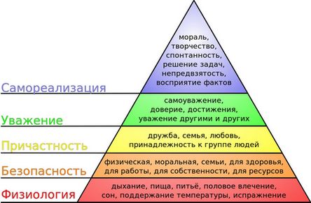 Маслоу сформировал так называемую пирамиду потребностей человека, в основании которой находятся физические потребности - в воде, пище, а на вершине - потребность в реализации, карьере