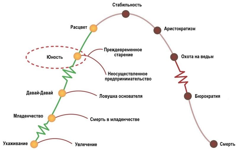 Жизненный цикл - это совокупность стадий; которые проходит организация за период своего функционирования: рождение, детство, юность, зрелость, старение, возрождение.