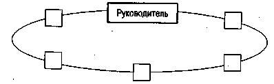Данная конфигурация замыкается на руководителе и не имеет централизации. Все крайние элементы связаны между собой, поэтому могут взаимодействовать сразу в двух направлениях.