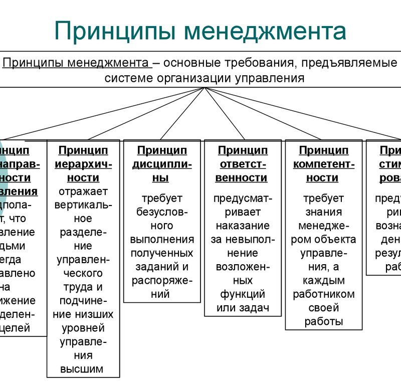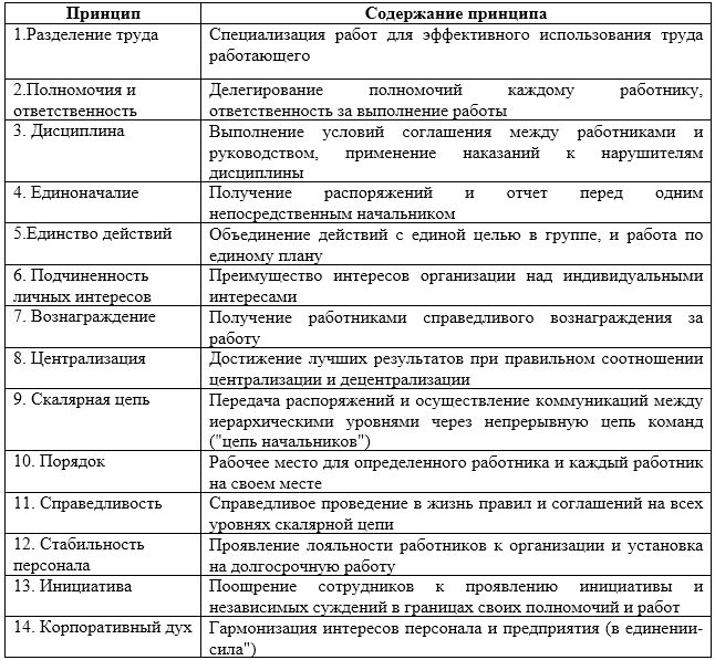Основными принципами, то есть правилами управленческой деятельности, являются разделение труда, дисциплина, вознаграждение, корпоративный дух, принцип порядка - "каждая вещь на своем месте", скалярная цель, иерархия, инициатива, единство действий, подчиненность личных интересов, справедливость, стабильность персонала.