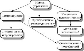В менеджменте выделяют три основных метода управления это: экономический метод, основанный на экономическом побуждение, к которому относится материальное стимулирование, зарплата премии; организационно - распределительных методы, основанные на регламентах, постановлениях; социально-психологические методы, которые направлены на мотивации, использовании психологических особенностей человеческой личности.