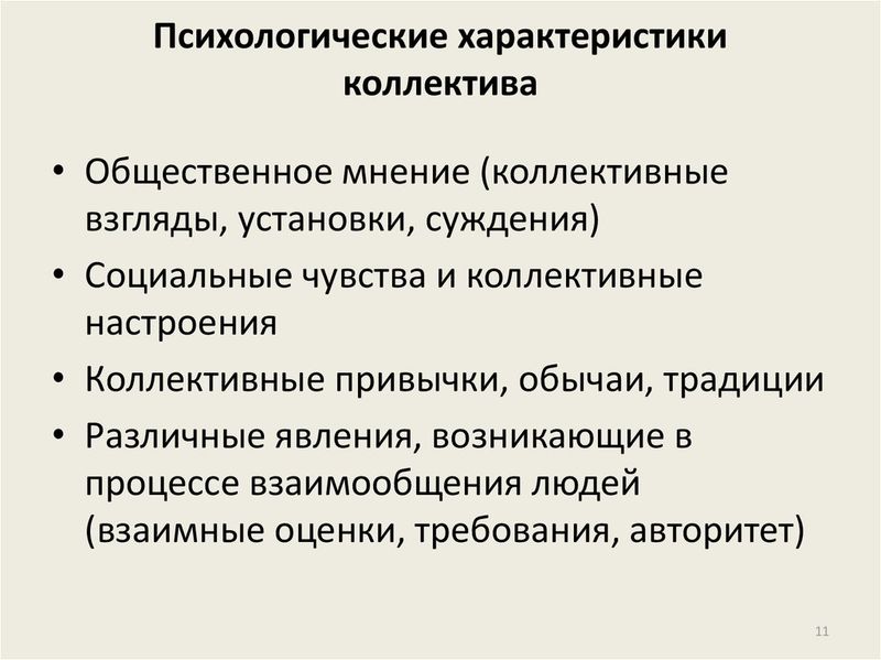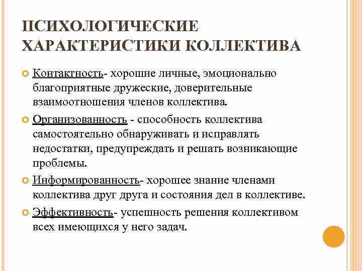 Психологическое различие коллектива проявляется в состоянии внутреннего психологического климата, психологического состояния и степени сплоченности участников. Психологический климат отражает состояние внутренних взаимоотношений в коллективе, на него оказывают влияние администрация, степень совместимости людей. Психологическое состояние - это степень удовлетворенности участников своим положением. На него влияет характер и содержание работы, отношения к ней, престижность. Психологическая сплоченность проявляется как психологическое единство сотрудников, по вопросам жизнедеятельности коллективов. Сплоченность коллектива во многом зависит от их психологической и социальной совместимости от характера и темперамента его участников.