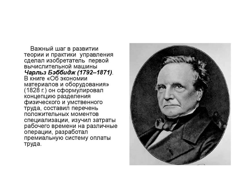 Автором первой книги в области научного управления является Ч. Беббидж. Именно он сформулировал концепцию разделения физического и умственного труда, так же он выступал за стимулирование творчества, активно занимался изучением затрат рабочего времени и поиском путей повышения эффективности труда на основе статистического анализа.