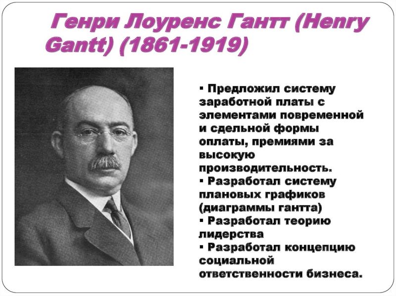 Г. Ганнт, помощник Тейлора считал, что человеческий фактор является основной движущей силой производства и важно уделять внимание обучению рабочих новым навыкам для сокращения затрат времени, он так же разработал систему "плановых графиков", и являлся одним из основателем концепции социальной ответственности бизнеса.