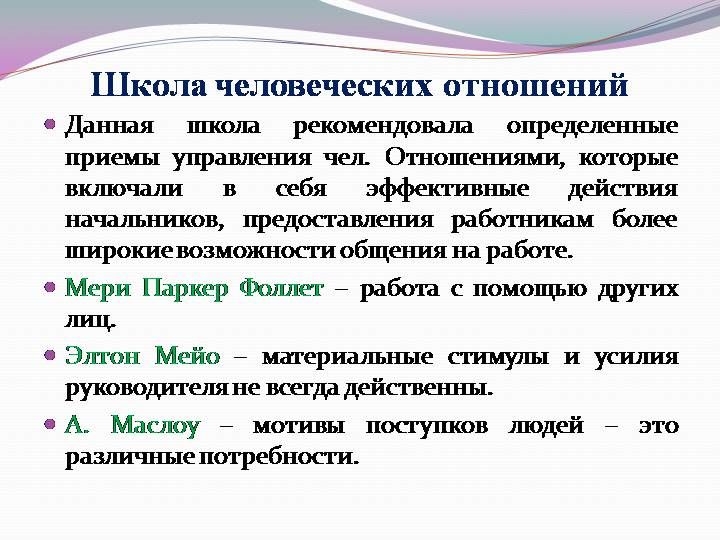 К основным представителям школы человеческих отношений можно отнести; Э. Мэйо, А. Маслоу, Д. МакГрегора, Ф. Герцберга. В своих работах они провели демократизацию управления и вовлекли рабочих к управлению, установлению норм, огромное значение придавали человеческому фактору.