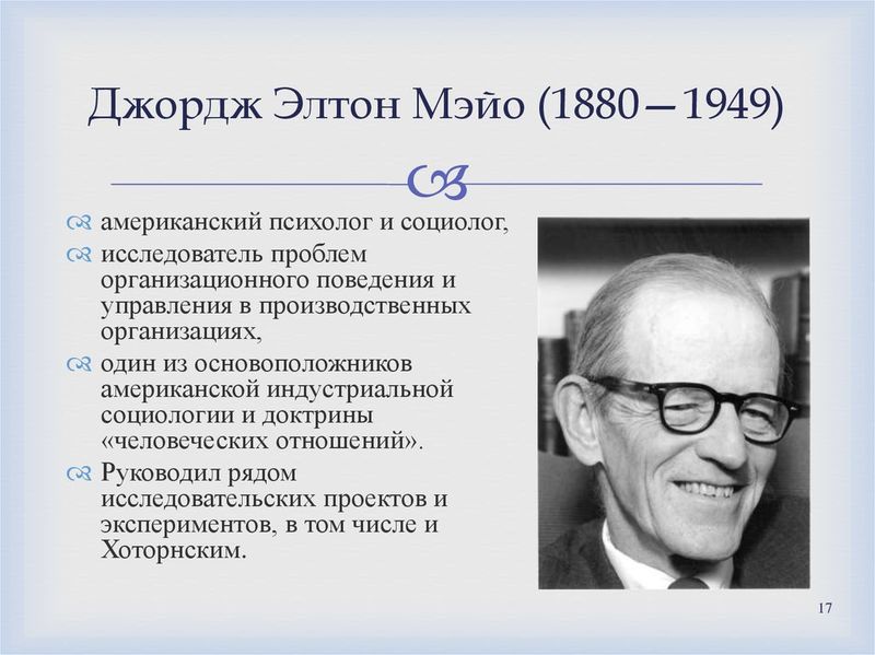 Автором экспериментов был Э. Мэйо. Результат эксперимента доказал, что на уровень производительности труда оказывают влияние и социально-экономические факторы. А в после военный период, когда все производственные мощности уже использовались на 100%, и основные идеи научной школы менеджмента были внедрены, такое открытие позволило руководителям корпораций вновь увеличивать свои доходы.