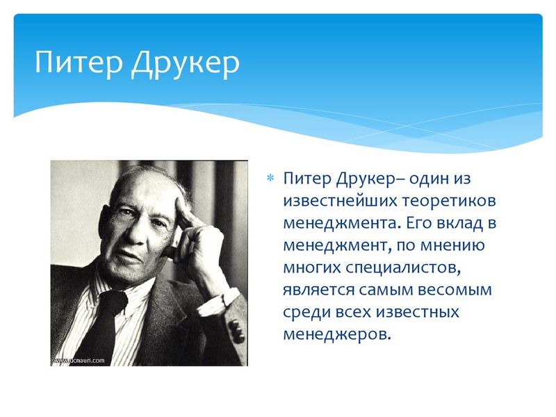 П. Друкер оказал значительное влияние на становление целостной концепции управление, и считал, что у менеджера в организации исключительная роль, связанная с искусством управления бизнеса, словно "дирижера в оркестре".