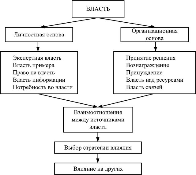 Власть это не только возможность, и но и способность оказывать влияние на действия других людей, даже вопреки их воли. Источником власти может являться организационная составляющая ( власть связей, власть на ресурсах) и власть, основанная на потребности личности (власть примера, экспертная власть, власть в информации, потребность во власти)