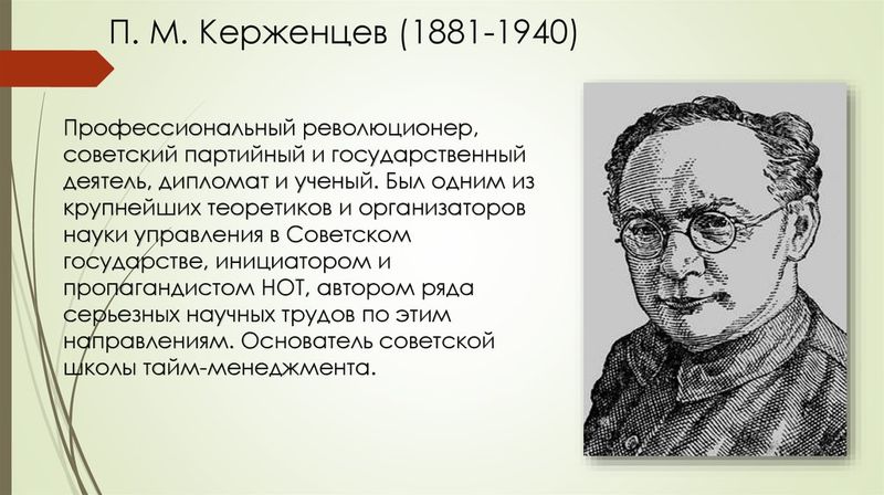 А. М. Керженцев является автором теория организационной деятельности в России. Он считал, что в научной организации труда существует три объекта: труд, производство, управление. Но самым важным из объектов считал управление. Так же он является основоположником идей "тайм менеджмента" в России.