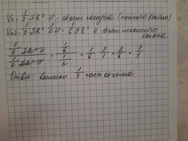 Бокал в форме конуса (задача) Из полного бокала, имеющего форму конуса, вылили часть так, что высота жидкости уменьшилось вдвое. Какую часть объема вылили?