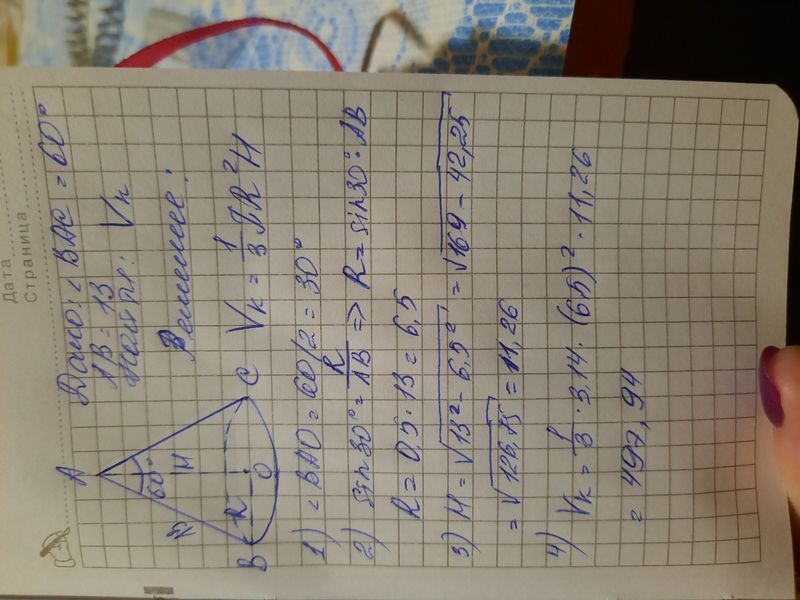Нужно решение и чертёж . Угол при вершине осевого сечения конуса равен 60.Образующая конуса равна 13 см. Найти объём конуса.