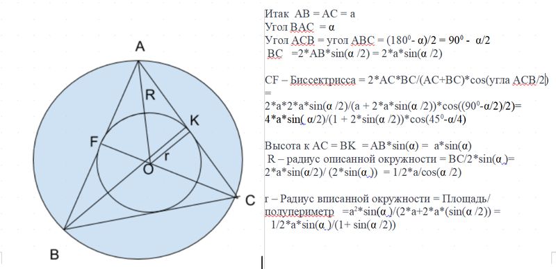Решите задачку по геометрии!! В равнобедренном треугольнике ABC AB=AC=a, уголBAC=альфа. Найти BC, биссектрису CF, высоту к AC, радиус вписанной окружности, радиус описанной окружности.