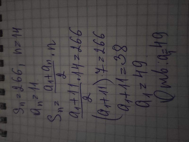 Домашнее задание математическое Сумма первых n членов арифметической прогрессии вычисляется по формуле Sn=(a1+an)2⋅n. Пользуясь этой формулой, вычислите значение a1, если an=11, Sn=266, n=14.