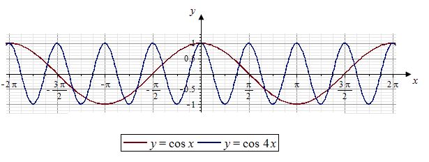 График y=cos(4x) получается из графика y=cos(x) сжатием в 4 раза к оси Oy: