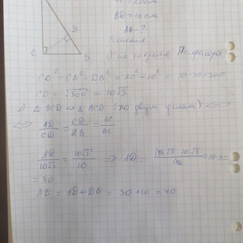 В прямоугольном ∆ABC к гипотенузе AB проведена высота CD. Найдите гипотенузу АВ, если BC = 20 см, BD = 10 см. В прямоугольном ∆ABC к гипотенузе AB проведена высота CD. Найдите гипотенузу АВ, если BC = 20 см, BD = 10 см.