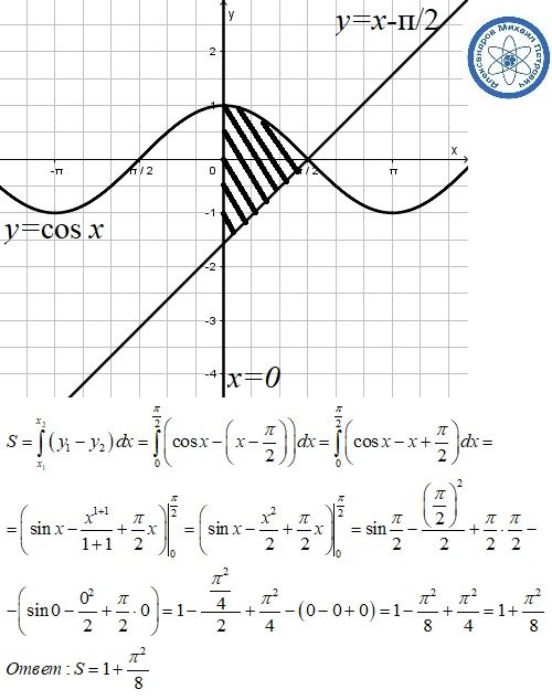 Вычислить площадь фигуры, ограниченной кривыми y=x-pi/2 и y=cosx x=0
