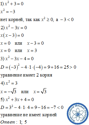 Выберите уравнения,которые не имеют корней 1)x2+3=0 (x2-икс квадрат)2)x2-3x=0 (x2-икс квадрат)3)x2-3x-4=0 (x2-икс квадрат)4)x2=3 (x2-икс квадрат)5)x2+3x+4=0 (x2-икс квадрат)