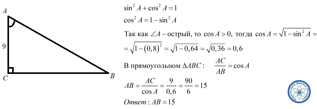 В треугольнике АВС угол С равен 90 градусов sinA=0,8 АС=9. Найти АВ