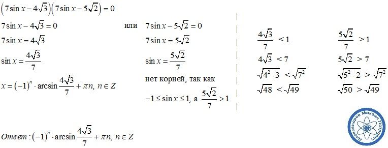 (7sinx-4корня из 3)(7sinx-5корней из 2)=0