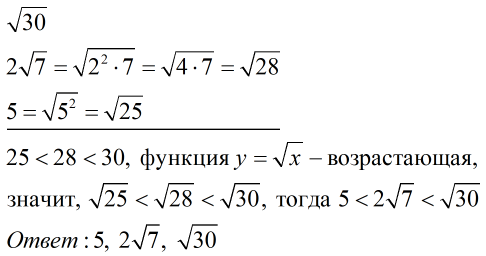 Расположите в порядке возрастания числа √30,2√7 и 5