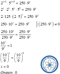 Решите уравнение:2^(x+1)*5^(x+3)=250*9^x