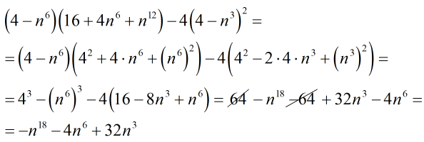 Упростите выражение: (4-n^6)(16+4n^6+n^12)-4(4-n^3)^2