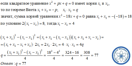 Удвоенная разность корней квадратного уравнения x^2-18x+q=0 равна 8. Найдите q? C решением