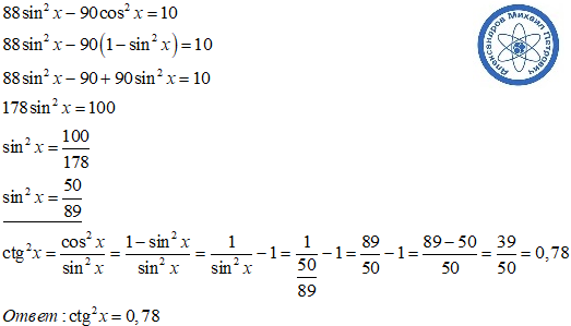 Вычислить: ctg^2, если 88sin^2-90cos^2=10